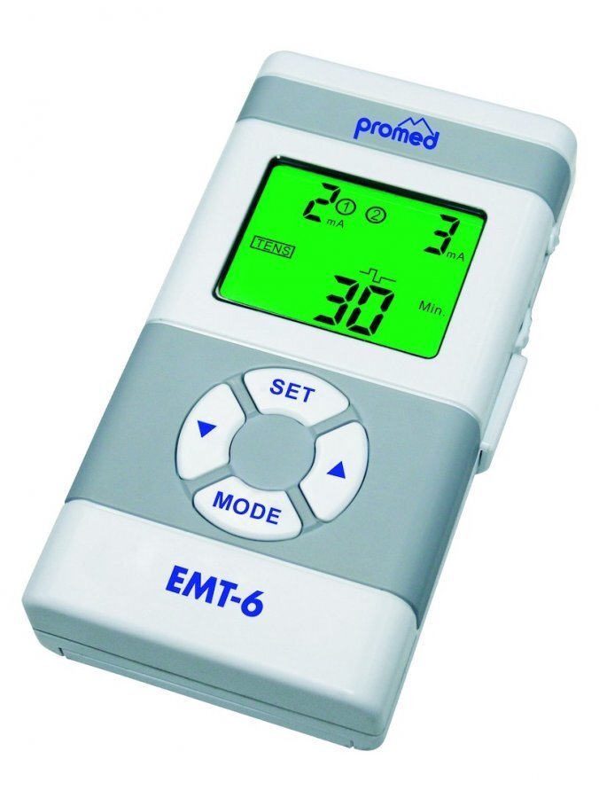 Niska-, selkä- ja lantiokivut ovat epämiellyttäviä, mutta hyvin yleisiä oireita. Promed EMT-6 -yhdistelmälaitteella on helppo lievittää ja hoitaa kroonisia ja akuutteja kiputiloja. Laitteen avulla hoitoa on helppo kohdentaa juuri haluttuun kehon kohtaan. Yhdistelmälaitteessa on kuusi esiasennettua ohjelmaa sekä kaksi vapaasti ohjelmoitavaa TENS-ohjelmaa sekä viisi esiasennettua ja kaksi vapaasti ohjelmoitavaa EMS-ohjelmaa. Laitteeseen voidaan tallentaa jopa 30 hoitotietoa. Laitteen tekniset tiedot: TENS / EMS -yhditelmälaite, 2-kanavaa, kanavien väli on eristetty. Käyttömoodi: jatkuva, syke, modulaatio. Ulostuloteho: 0100 mA (1 000 ohm kuormalla), 100-portainen, 1mA/porras, impulssitaajuus: 2 Hz125 Hz (säädettävä), impulssilaajuus: 50 µs330 µs (säädettävä). Käytön kesto: 160 min ja jatkuva. Pulssimuoto: bifaasinen suorakulma. Virtalähde: 6,0 V, 4 x AAA-paristo, paristo: LR41, 1,2 V. Pakkaus sisältää 1 x EMT-6-laite (40 x 40 mm), 2 x elektrodijohtoa, 1 x säilytyspakkaus, 4 x paristoa, 1 x käyttöohje.