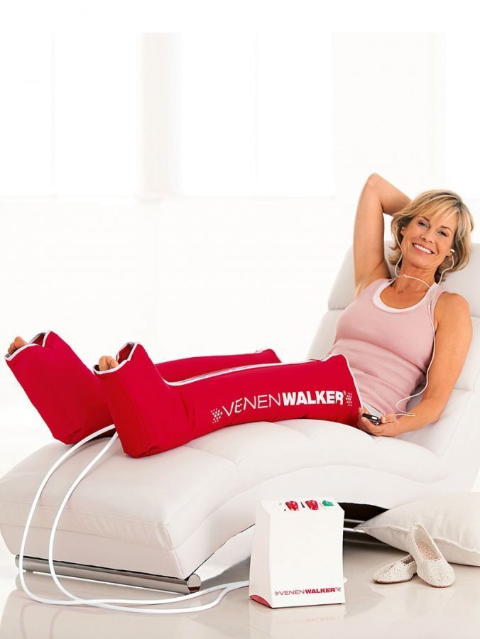 Vitalmaxx VenenWalker. Sertifioitu lääketieteellinen tuote jalkojen hyvinvointiin. Ihanteellinen verisuoniperäisten jalkasärkyjen, suonikohjujen, väsyneiden ja turvonneiden jalkojen, urheiluvammojen sekä selluliitin hoitoon. Patentoitu paineen vaihtelulla toimiva lihasten stimulointi voi auttaa parantamaan verenkiertohäiriöitä sekä aktivoimaan lihaskudosta hellävaroin. Vilkastuttaa jalkojen verenkiertoa. Saattaa vähentää turvotuksia. Voi auttaa parantamaan jalkojen hyvinvointia. Voidaan käyttää myös jalkapohjien hierontaan. Helppo ja turvallinen käyttää. Erittäin hyvin istuva mansettimalli, reiden suurin ympärysmitta 72 cm. Sisältää kaksi kolmitaskuista jalkamansettia, ohjauslaitteen sekä verkkolaitteen. Ohjeen mukaisessa käytössä täysin vaaraton ja ilman sivuvaikutuksia. VenenWalker-laitteen paineen vaihteluun perustuva toiminta jäljittelee klassista, manuaalista jalkajumppaa. Jalkamansettien ja säilytyspussin materiaalit: 100 % nailonia (laukku ja säilytyspussi), 100 % polyesteriä (säilytyspussin kahvat), 100 % teknistä muovia POM-C (säilytyspussin vetoketjut) ja 100 % puuvillaa (vahvikkeet).